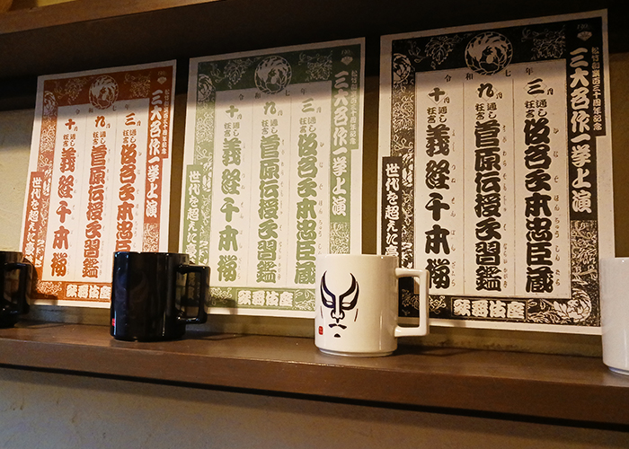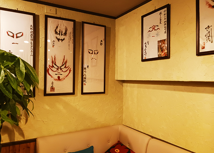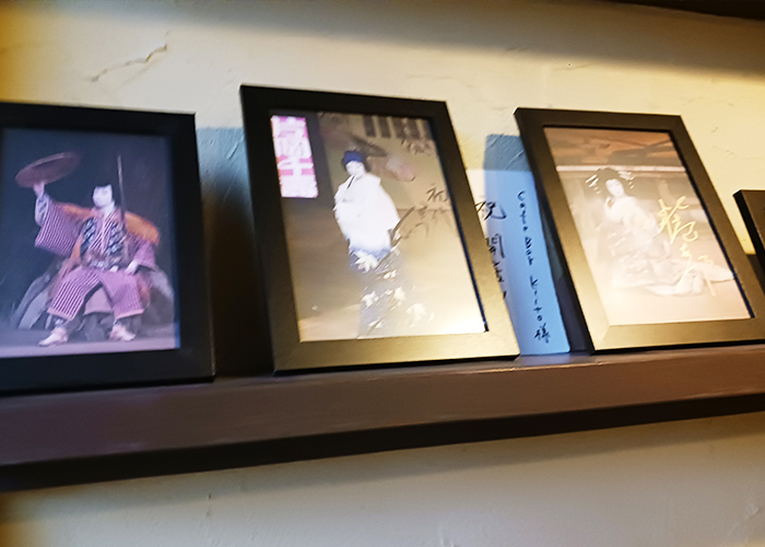 店内に入ると、ふんわりと流れるピアノの音。開店祝いのお花や、サイン入りの歌舞伎写真が飾られていて、ふと別世界に迷い込んだような気分になります。驚いたことに、お祝いの花には片岡愛之助さんご夫妻のお名前も!