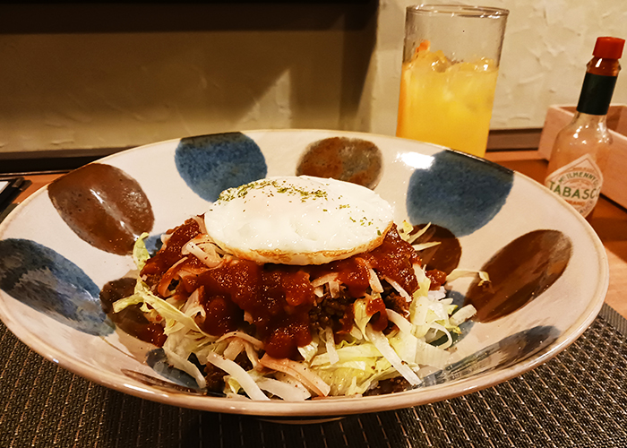 しばらくして運ばれてきたタコライスは、大きな深皿に盛りつけられていて、見た目にもインパクト大! このお皿、移住直後に親切にしてくれた「パウザ」というレストランのオーナーさんからの贈り物なんだそうです。五島産の卵をカリッと焼いた目玉焼きがのり、スプーンで割るととろりと黄身がとけ出して……甘めに味付けされたひき肉と、シャキシャキのレタス、チーズのバランスも抜群。お好みでタバスコをかけても◎。ボリュームもたっぷりで、大満足の一皿です。