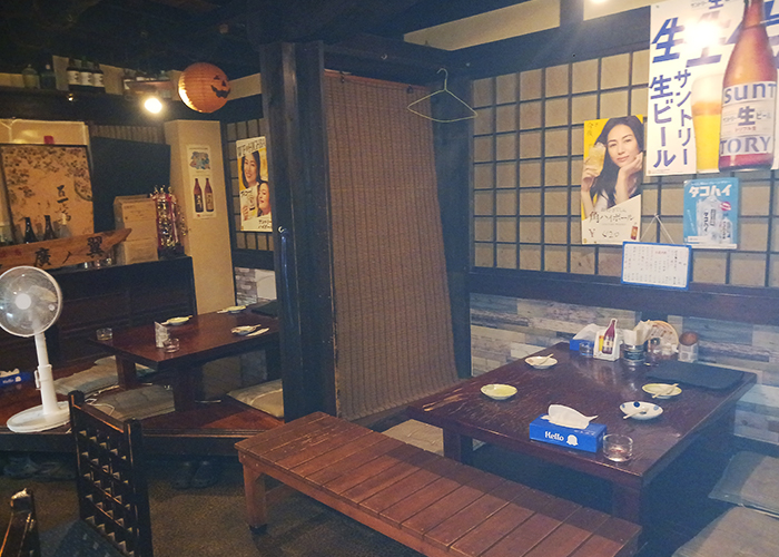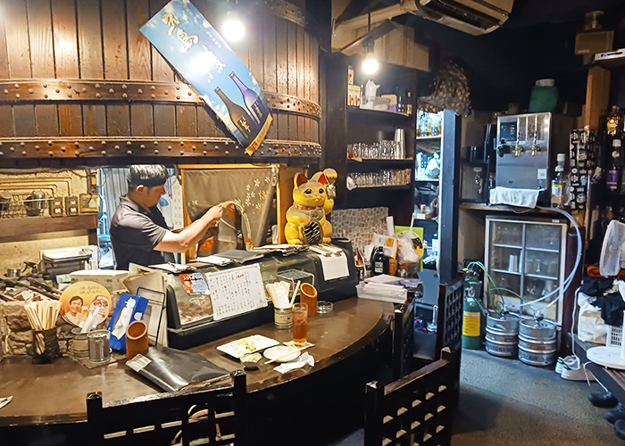 店内はこぢんまりとしていて、円形の焼き台を囲むように設けられたカウンター席が6席ほど。奥には仕切りのある小上がりの座敷が2つあり、ひとりでも、友人や家族とでも、気兼ねなく食事の時間を楽しめます。焼き場の中心には笑顔が素敵な大将。ほどよい距離感で、会話も焼き鳥も楽しませてくれる名人です。