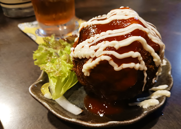 まずコロッケは、想像とはちょっと違う姿で登場します。平たい形ではなく、まるで大きなたこ焼きのようなまんまるのボール型。揚げたての衣には、香ばしいソースとマヨネーズがとろり。ひと口かじれば中からチーズがとろ~りとろけ出し、ホクホクのじゃがいもと絶妙に絡み合って、口の中は幸せの渦に包まれます。
