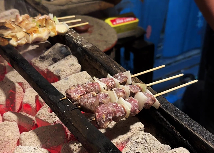 メインの焼き鳥には、五島地鶏が使われています。旨みがぎゅっと詰まったお肉は、噛むほどに味わい深く、ついついお酒が進んでしまいます。そのほかにも鶏の刺身や五島牛など、地元の豊かな食材を生かしたメニューが並び、どれも食通を唸らせるものばかり。中でも、イカの串焼きは香ばしく焼き上げられ、レモンサワーとの相性が抜群。海風を感じるような一品に、思わず笑みがこぼれます。