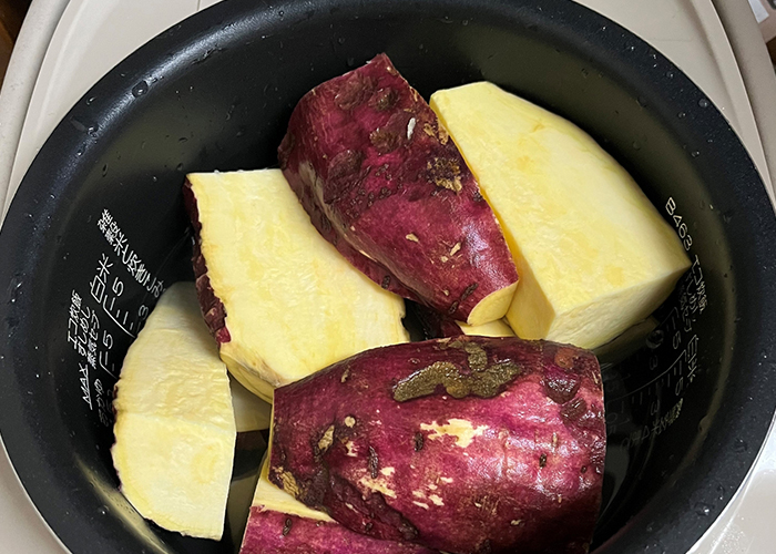 - さつまいもをよく洗い、炊飯釜に入れます。釜のサイズに合わせて、長い場合は半分にカットしてください。