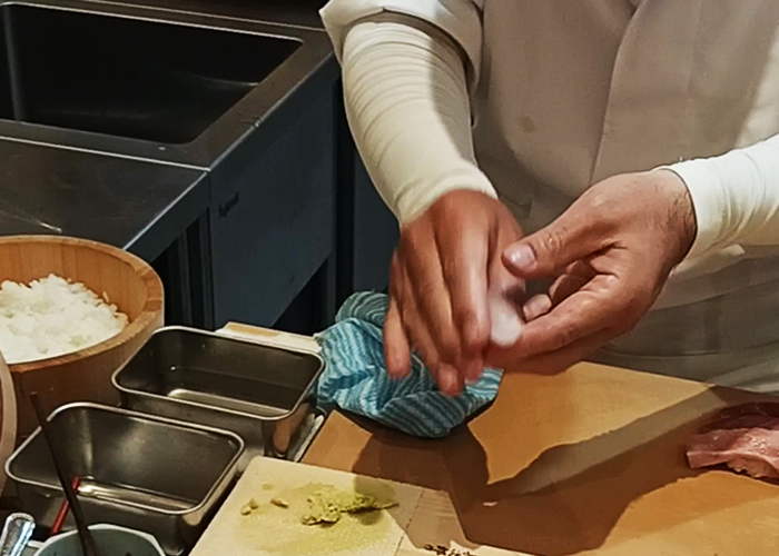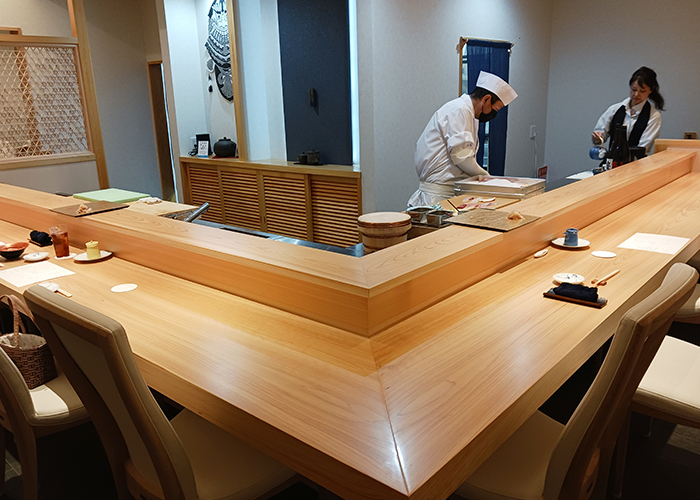 店内で鮨を握っていたのは、関東から夫婦で福江島に移住してきた職人さん。都会の喧騒を離れ、この島で新しい挑戦をはじめたそうです。もうひとりの女性スタッフの方も同じく移住者で、料理だけでなく五島での暮らしや日々の出来事まで、丁寧にお話してくださいました。
