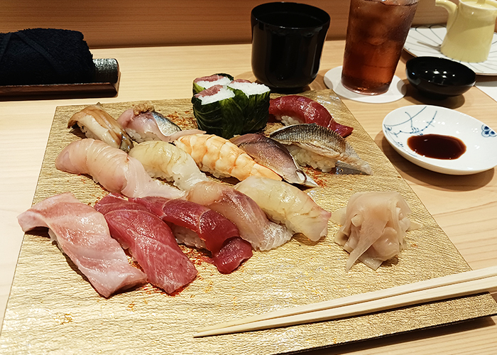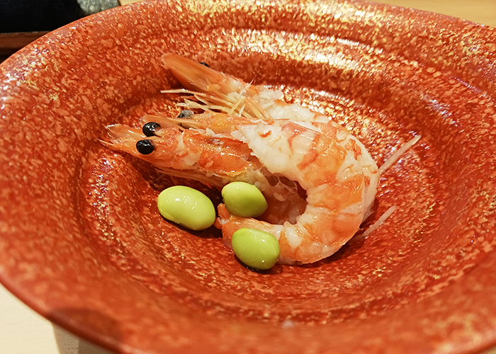 この日いただいたのは、前菜・鮨10貫・汁物・デザートがセットになった特別コース。最初に登場した茹でエビから始まり、次々と提供されるお鮨は、どれも見た目からして美しい逸品ばかり。