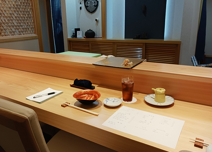 調理場を中心に据えた10席のカウンター。静けさの中に流れる緊張感と温もり。目の前で繰り広げられる職人の丁寧な手仕事に、自然と背筋が伸びてしまうような、そんな特別な時間がゆっくりと流れていました。