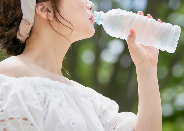 涼しい場所で体を冷やしながら、失われた水分と塩分を補給します。汗をかくと、水分と一緒に体内の塩分(ナトリウムなどの電解質)も失われてしまいます。この状態で水だけを大量に飲むと、かえって体内の塩分濃度が薄まってしまい、体調不良を悪化させることもあるため注意が必要です。意識がはっきりしていて、吐き気や嘔吐がなく、自分で飲むことができる場合に限り、水分と塩分を一緒に補給しましょう。