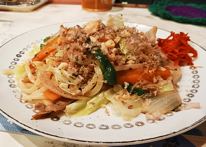 奥のキッチンから香ばしいソースの香りが漂ってきます。出てきた焼きうどんは、野菜たっぷりで鰹節が踊る、素朴ながらも食欲をそそる一皿。ボリュームもしっかり。甘辛いソースが絶妙で、熱々のうちにいただくと、思わず笑顔がこぼれます。