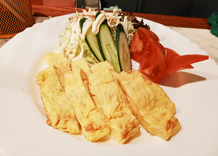 続いて登場した出汁巻き卵は、驚きの大きさ。そしてその横には、同じくらいの量のサラダが!居酒屋でここまでしっかりしたサラダがついてくるとは驚き。マヨネーズもクリーミーで卵と好相性。ふんわりとした食感に、塩味のきいたやさしい味わい。焦げ目のない美しい焼き色で、まさに職人技です。これぞ「五島一」の出汁巻き卵かもしれません。