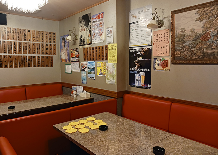 おそるおそるドアを開けてみると、意外にも広い店内。カウンターには3人のお客さんが座っていて、右手には広めのテーブル席が2台。カラオケルームのような雰囲気も感じられます。壁にはたくさんの手書きメニューが並び、ご飯ものや麺類も豊富で期待が高まります。