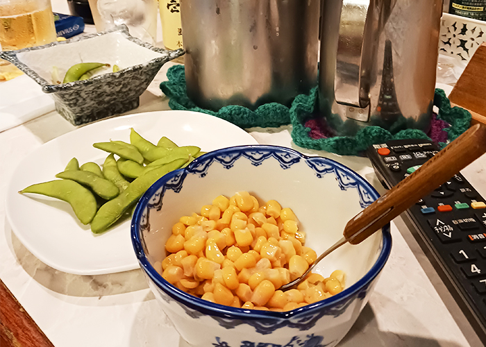 すぐに出せるメニューは枝豆とバターコーン。人気料理は出汁巻き卵、焼きうどん、オムライスだそう。今回は、出汁巻き卵と焼きうどんを注文しました。