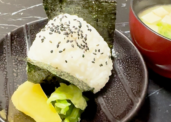 食事の締めには、香り豊かなアオサの味噌汁と、ほんのりとお米の甘さを感じる黒ごまのおにぎり。お腹も心もやさしく満たされ、最後まで余韻に浸れる時間が過ごせます。